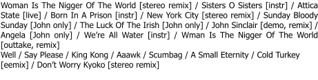 click the picIntroduction by Klas Burling / I Saw Her StandingThere / From Me To You / Money (That’s What IWant) / Klas Burling / Roll Over Beethoven / YouReally Got A Hold On Me / She Loves You / TwistAnd ShoutBo Diddley [stereo remix and remaster]:Cracklin’ / Rockin’ Bo / Dancin’ Girl / Let The Kids Dance /Mess Around / Somebody’s Crying / Hong Kong / Can IGo Home With You / I’m Going Home/ Rhyme Song / HayBo Diddley / Bo DiddleyCat Mother & The All-Night Newsboys:Along Came Jones / Rockin’ Pneumonia And The BoogieWoogie Beat / Wherever There’s A PartyChicago Transit Autority [remaster]:Intro / South California Purples / 25 Or 6 To 4 / DoesAnybody Really Know What Time It Is / I’m A Man /Questions 67 & 68 / LiberationTony Joe White:Too Hard To Handle / Jammin’Jerry Lee Lewis:Don’t Be Cruel / Hound Dog / Mean Woman Blues (I Got A Woman) / Great Balls Of Fire / Mystery Train (ft. KennyLovelace) / Whole Lotta Shakin’ Goin’ OnLittle Richard [stereo remix and remaster]Blueberry Hill / Lucille / Good Golly Miss Molly / Rip It Up/ Trutti Frutti / Keep A-Knockin’ / Hound Dog / JennyJenny / Long Tall SallyChuck Berry:Rock And Roll Music / Nadine / School Days / Wee WeeHours / Medley: Johnny B. Goode-Promised Land /Hoochie Coochie Man / Memphis Tennessee / Too MuchMonkey Business / Reelin’ And Rockin’ / Sweet LittleSixteen / My Ding-A-Ling / Bonsoir Cherie / Johnny B.Goode / MaybellineAlice Cooper [stereo remix and remaster]:No Longer Umpire / Lay Down And Die, Goodbye (Pt. 1) /Lay Down And Die, Goodbye (Pt. 2) / Don’t Blow YourMind / Nobody Likes Me / Fields Of RegretGene Vincent [stereo remix and remaster]Intro / Be-Bop-A-Lula (fragment 1-3, edit)Plastic Ono Band:Blue Suede Shoes / Money / Dizzy Miss Lizzy / Yer Blues / Cold Turkey / Give Peace A Chance / John John (Let’sHope For Peace) / Don’t Worry KyokoThe Doors [Stereo remix and remaster] [v2]:When The Music Is Over / Break On Through / Back DoorMan-Road House Blues / The Crystal Ship / TheCelebration Of The Lizard / Light My Fire / The EndIntroduction / Chubby Checker: Pony Time / Let’sTwist Again / The Twist / Interlude #1 / Bill Haley &The Comets: Rock Around The Clock / Shake, Rattle& Roll / Interlude #2 / Danny & The Juniors: AtThe Hop / Interlude #3 / Fats Domino: My BlueHeaven / Blueberry Hill / Anouncement / TheShirelles: Everybody Loves A Lover / Soldier Boy /Interlude #4 / The Coasters: Poison Ivy / CharlieBrown / Interlude #5 / Intro / Bo Diddley: I’m AMan / Hey Bo Diddley / The Five Satins: Medley-InThe Still Of The Night-Earth Angel / I’ll Be SeeingYou-In The Still Of The Night (reprise) / Doku /Interlude #6 / Little Richard: Lucille / Good GollyMiss Molly / Rip It UpRemaster of the R2R Tape BEL L 89002 (khundalini 2022)Wonder Boy (I Love You) [Single A-Side] / OrangeColored Sky [Single B-Side] / The Comedian (backingtrack #1) / Teenage Bill Of Rights (outtake) / TearsCome From Loving You (backing track) / Gotta Fall InLove (backing track) / The Comedian (backing track#2) / Wonder Boy (I Love You) (demo) / OrangeColoured Sky (demo) / Various False StartsBonus tracks: Wonder Boy (I Love You) [stereo remix] / Orange colored Sky [stereo remix] / Teenage Bill Of Rights [stereo remix]Throwing Fire In The Sun / Light Years / Walk This World/ Island / Truth And Bone / I’m On Fire / Blue Black-Sugar Bonus: Greatings From Heather / Interview with Alan BanksYou will certainly find some of the titles on this page in some torrents, blogs or on YouTube, but all compilations collected here are unique in their excellent sound quality!Woman Is The Nigger Of The World (remix) / Sisters OSisters (instr.) / Attica State (live) / Born In A Prison(instr.) / New York City (remix) / Sunday BloodySunday (John only) / The Luck Of The Irish (John only)/ John Sinclair (demo) / Angela (John only) / We’re AllWater (instr.) / Woman Is The Nigger Of The World(outtake) / Well (Baby Please Don’t Go) / Say Please /King Kong / Aaawk / Scumbag / A Small Eternity / ColdTurkey (remix) / Don’t Worry KyokoVol.1 Chicago Transit AuthorityIntro / Come On Everybody... Let Us Play For You / Piano Intro / Does Anybody Really Know What Time It Is / South California Purples / Beginnings / 25 Or 6 To 4 / Announcements / I'm A ManThis is one of the bootlegs that has appeared very often in various versions. Most of the time, the individual concerts were decoupled separately. From a sound-technical point of view, I was of the opinion: Something else is possible here!Vol. 2 The James Cotton Blues BandCut You Loose / Fallin' Rain / Heart Attack / Knock OnWood / Nine Below Zero / Dust My Broom / The Creeper/ Turn On Your Lovelight / Please Please PleaseVol. 3 Janis Joplin & The Kozmic Blues BandRaise Your Hand / As Good As You Been To This World / Try (Just A Little Bit Harder) / Maybe / To LoveSomebody / SummertimeVol. 4 Rotary ConnectionLady Jane / Ruby Tuesday / Stormy Monday / SunshineOf Your Love / Let The People TalkVol. 5 SantanaEvil Ways / You Just Don't Care / Shades Of Time / Jingo / Treat / Soul SacrificeVol. 6 Led ZeppelinTrain Kept A-Rollin' / I Can't Quit You / Dazed AndConfused / You Shook Me / How Many More Times (Part1) / How Many More Times (Part 2) / CommunicationBreakdownVol. 7 SpiritRehearsal Theme / I'm Truckin' / Fresh Garbage / PoorRichard / Caught / Groudhog Day / Policeman's Ball /Drums / Mechanical World / I Got A Line On You / Aren't You GladVol. 8 B.B. KingIntroduction / Sweet Sixteen / Please Accept My Love /Band Intro / Everybody wants To Know Why I Sing TheBlues / Don't Want A Soul Hanging Around / What'sWrong Little Mama / How Blue Can You Get / Whole LotOf Lovin' / Everyday I Have The BluesVol. 9 Johnny WinterIntroduction / Mean Town Blues / Black Cat Bone / Mean Mistreater / Talk To Your Daughter / Leland, Mississippi / I Can Love You BabyVol. 10 Ten Years AfterGood Morning Little Schoolgirl / I Can't Keep From Cryin'Sometimes / Hobbit / Spoonful / I'm Goin' HomeVol. 11 Sly & The Family Stone & 