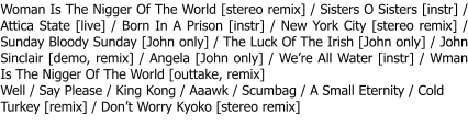 click the picIntroduction by Klas Burling / I Saw Her StandingThere / From Me To You / Money (That’s What IWant) / Klas Burling / Roll Over Beethoven / YouReally Got A Hold On Me / She Loves You / TwistAnd ShoutBo Diddley [stereo remix and remaster]:Cracklin’ / Rockin’ Bo / Dancin’ Girl / Let The Kids Dance /Mess Around / Somebody’s Crying / Hong Kong / Can IGo Home With You / I’m Going Home/ Rhyme Song / HayBo Diddley / Bo DiddleyCat Mother & The All-Night Newsboys:Along Came Jones / Rockin’ Pneumonia And The BoogieWoogie Beat / Wherever There’s A PartyChicago Transit Autority [remaster]:Intro / South California Purples / 25 Or 6 To 4 / DoesAnybody Really Know What Time It Is / I’m A Man /Questions 67 & 68 / LiberationTony Joe White:Too Hard To Handle / Jammin’Jerry Lee Lewis:Don’t Be Cruel / Hound Dog / Mean Woman Blues (I Got A Woman) / Great Balls Of Fire / Mystery Train (ft. KennyLovelace) / Whole Lotta Shakin’ Goin’ OnLittle Richard [stereo remix and remaster]Blueberry Hill / Lucille / Good Golly Miss Molly / Rip It Up/ Trutti Frutti / Keep A-Knockin’ / Hound Dog / JennyJenny / Long Tall SallyChuck Berry:Rock And Roll Music / Nadine / School Days / Wee WeeHours / Medley: Johnny B. Goode-Promised Land /Hoochie Coochie Man / Memphis Tennessee / Too MuchMonkey Business / Reelin’ And Rockin’ / Sweet LittleSixteen / My Ding-A-Ling / Bonsoir Cherie / Johnny B.Goode / MaybellineAlice Cooper [stereo remix and remaster]:No Longer Umpire / Lay Down And Die, Goodbye (Pt. 1) /Lay Down And Die, Goodbye (Pt. 2) / Don’t Blow YourMind / Nobody Likes Me / Fields Of RegretGene Vincent [stereo remix and remaster]Intro / Be-Bop-A-Lula (fragment 1-3, edit)Plastic Ono Band:Blue Suede Shoes / Money / Dizzy Miss Lizzy / Yer Blues / Cold Turkey / Give Peace A Chance / John John (Let’sHope For Peace) / Don’t Worry KyokoThe Doors [Stereo remix and remaster] [v2]:When The Music Is Over / Break On Through / Back DoorMan-Road House Blues / The Crystal Ship / TheCelebration Of The Lizard / Light My Fire / The EndIntroduction / Chubby Checker: Pony Time / Let’sTwist Again / The Twist / Interlude #1 / Bill Haley &The Comets: Rock Around The Clock / Shake, Rattle& Roll / Interlude #2 / Danny & The Juniors: AtThe Hop / Interlude #3 / Fats Domino: My BlueHeaven / Blueberry Hill / Anouncement / TheShirelles: Everybody Loves A Lover / Soldier Boy /Interlude #4 / The Coasters: Poison Ivy / CharlieBrown / Interlude #5 / Intro / Bo Diddley: I’m AMan / Hey Bo Diddley / The Five Satins: Medley-InThe Still Of The Night-Earth Angel / I’ll Be SeeingYou-In The Still Of The Night (reprise) / Doku /Interlude #6 / Little Richard: Lucille / Good GollyMiss Molly / Rip It UpRemaster of the R2R Tape BEL L 89002 (khundalini 2022)Wonder Boy (I Love You) [Single A-Side] / OrangeColored Sky [Single B-Side] / The Comedian (backingtrack #1) / Teenage Bill Of Rights (outtake) / TearsCome From Loving You (backing track) / Gotta Fall InLove (backing track) / The Comedian (backing track#2) / Wonder Boy (I Love You) (demo) / OrangeColoured Sky (demo) / Various False StartsBonus tracks: Wonder Boy (I Love You) [stereo remix] / Orange colored Sky [stereo remix] / Teenage Bill Of Rights [stereo remix]Throwing Fire In The Sun / Light Years / Walk This World/ Island / Truth And Bone / I’m On Fire / Blue Black-Sugar Bonus: Greatings From Heather / Interview with Alan BanksYou will certainly find some of the titles on this page in some torrents, blogs or on YouTube, but all compilations collected here are unique in their excellent sound quality!Vol.1 Chicago Transit AuthorityIntro / Come On Everybody... Let Us Play For You / Piano Intro / Does Anybody Really Know What Time It Is / South California Purples / Beginnings / 25 Or 6 To 4 / Announcements / I'm A ManThis is one of the bootlegs that has appeared very often in various versions. Most of the time, the individual concerts were decoupled separately. From a sound-technical point of view, I was of the opinion: Something else is possible here!Vol. 2 The James Cotton Blues BandCut You Loose / Fallin' Rain / Heart Attack / Knock OnWood / Nine Below Zero / Dust My Broom / The Creeper/ Turn On Your Lovelight / Please Please PleaseVol. 3 Janis Joplin & The Kozmic Blues BandRaise Your Hand / As Good As You Been To This World / Try (Just A Little Bit Harder) / Maybe / To LoveSomebody / SummertimeVol. 4 Rotary ConnectionLady Jane / Ruby Tuesday / Stormy Monday / SunshineOf Your Love / Let The People TalkVol. 5 SantanaEvil Ways / You Just Don't Care / Shades Of Time / Jingo / Treat / Soul SacrificeVol. 6 Led ZeppelinTrain Kept A-Rollin' / I Can't Quit You / Dazed AndConfused / You Shook Me / How Many More Times (Part1) / How Many More Times (Part 2) / CommunicationBreakdownVol. 7 SpiritRehearsal Theme / I'm Truckin' / Fresh Garbage / PoorRichard / Caught / Groudhog Day / Policeman's Ball /Drums / Mechanical World / I Got A Line On You / Aren't You GladVol. 8 B.B. KingIntroduction / Sweet Sixteen / Please Accept My Love /Band Intro / Everybody wants To Know Why I Sing TheBlues / Don't Want A Soul Hanging Around / What'sWrong Little Mama / How Blue Can You Get / Whole LotOf Lovin' / Everyday I Have The BluesVol. 9 Johnny WinterIntroduction / Mean Town Blues / Black Cat Bone / Mean Mistreater / Talk To Your Daughter / Leland, Mississippi / I Can Love You BabyVol. 10 Ten Years AfterGood Morning Little Schoolgirl / I Can't Keep From Cryin'Sometimes / Hobbit / Spoonful / I'm Goin' HomeVol. 11 Sly & The Family Stone & FriendsM'Lady / Sing A Simple Song / You Can Make It If YouTry / Stand - Love City - Higher / Everyday People /Dance To The Music - Music Lover / I Wanna Take YouHigher - JamVol. 12 V.A. Partial 1Grand Funk Railroad: Intro / Are You ReadyIncredible String Band: Intro / Waiting For You / Black Jack DavySam & Dave: I've Been Loving You Too Long / May I Baby?Herbie Mann: Tangier / ImprovisationCanned Heat: Intro / Bullfrog Blues / Rollin' And Tumblin' / Talk / 